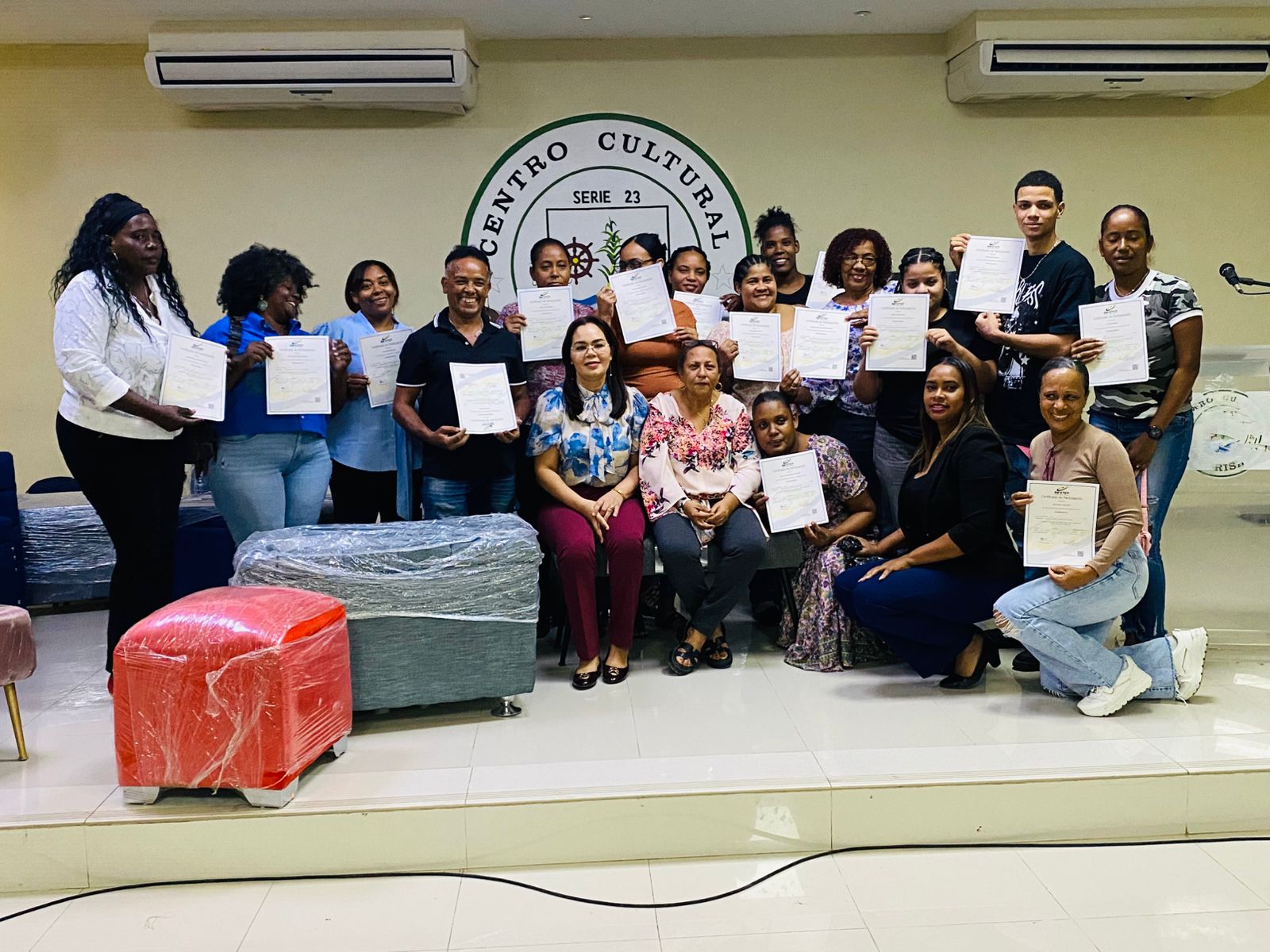 La vicealcaldesa del Ayuntamiento de San Pedro de Macorís, Wendy Reyes, encabezó el acto de entrega de certificados a los participantes del curso de tapicería, impartido por el Departamento de Género, bajo la dirección de Nelly de la Cruz.
